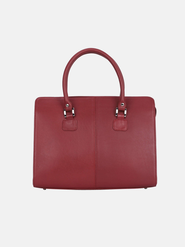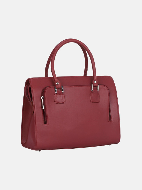 -Brick red leather bag with gabardine lining. Features zip closure, one front zip pocket, multiple compartments and pockets and two leather handles.
