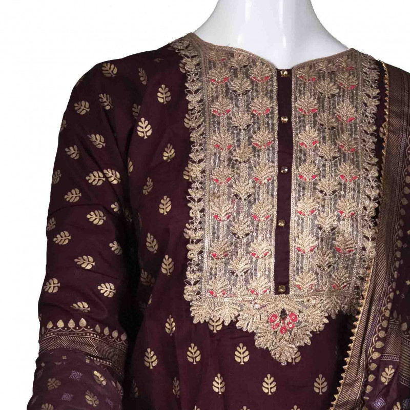 - Whole Kameez Coffee Color with Golden Fabric Printed Pattern Straight Calf Length. Has a Designer Neck. Three Quarter Sleeves, side slits.