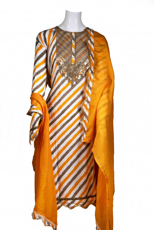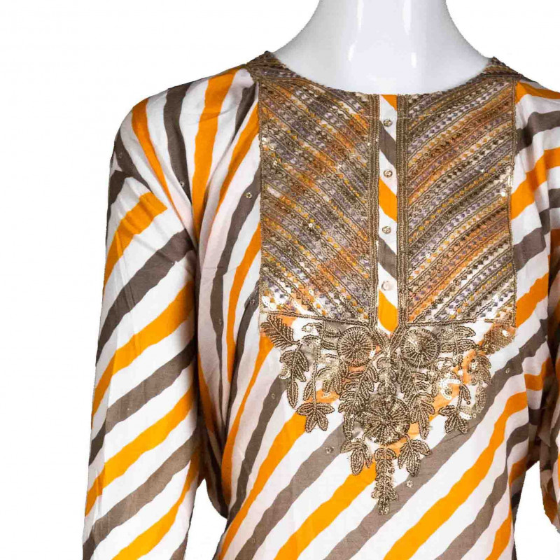 - Yellow, White And Camel Brown Color Stripped Straight Calf Length. Has a Round Neck With Beautiful Zari Sequence Lace. Three Quarter Sleeves, side slits.