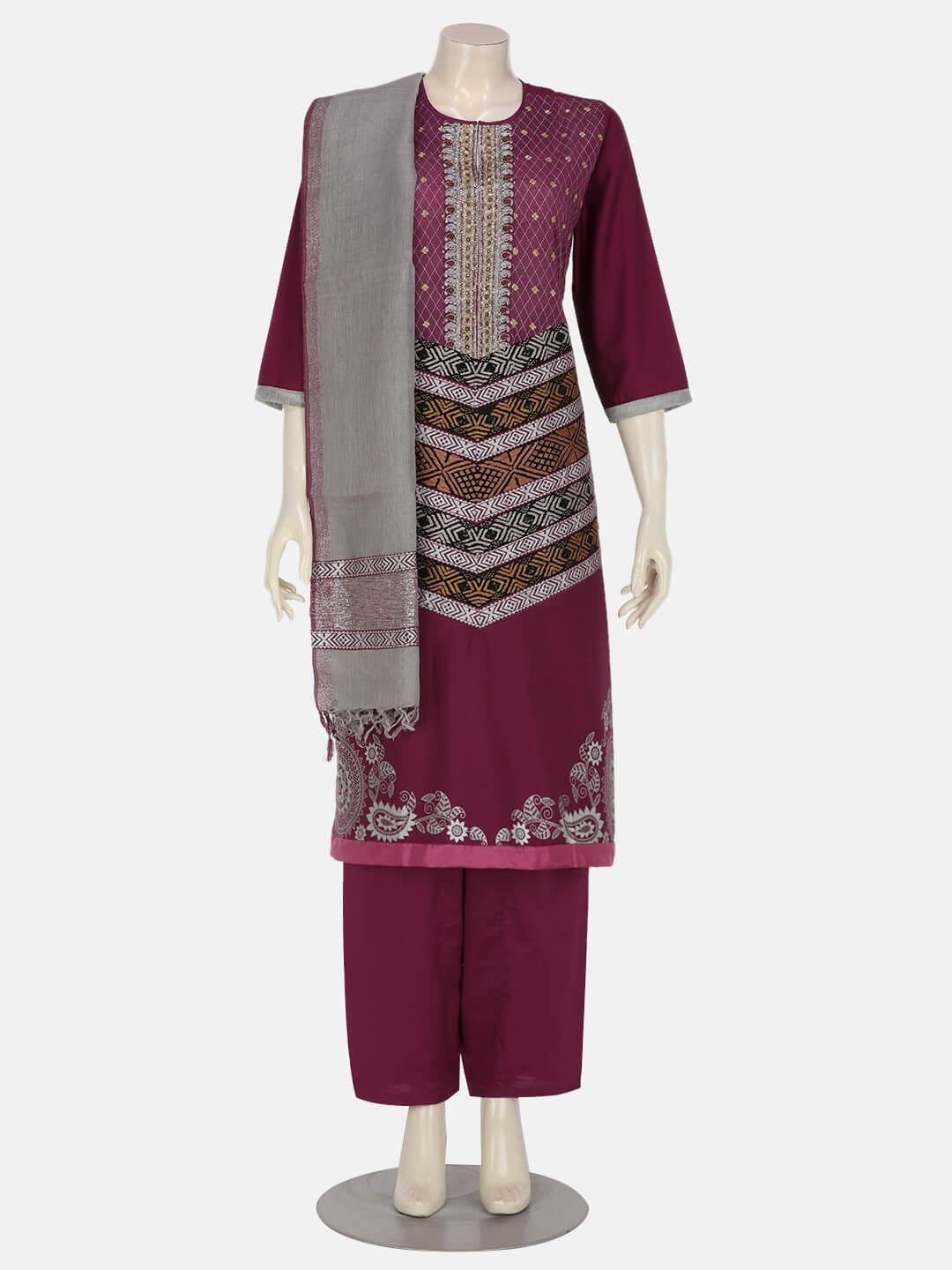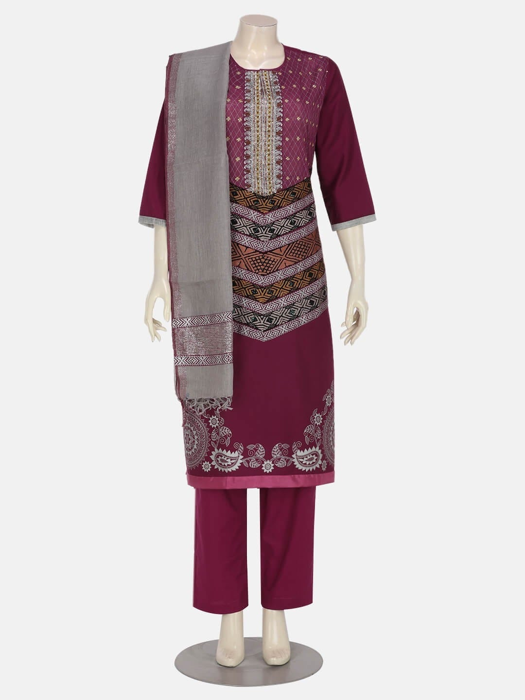 - Dark fuchsia printed viscose-cotton kameez with embroidery.