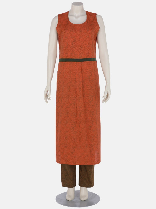 - Deep orange printed cotton kameez. Brown printed coaty with embroidery and sequin detailing.