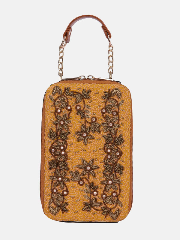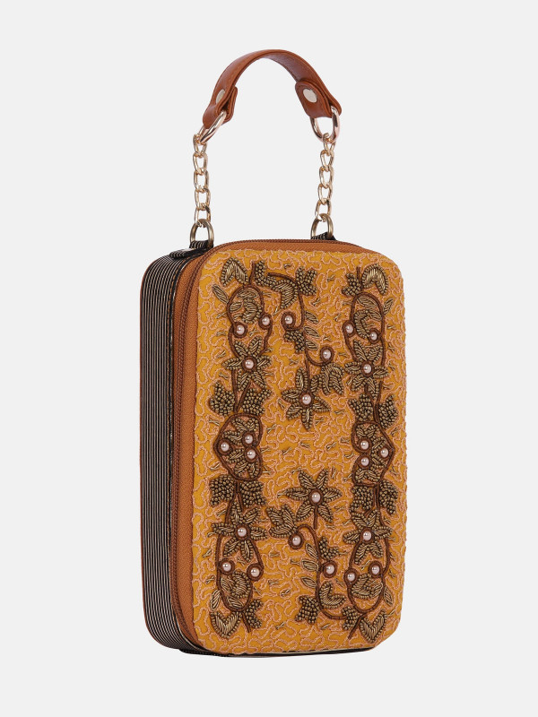 -Features zip opening, one brown leather and metal chain made handle, one compartment and pocket for carrying essential.