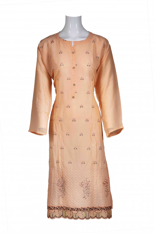 - Whole Kameez Peach Color with Embroidery Straight Calf Length. Has a Round Neck. Three Quarter Sleeves, side slits.