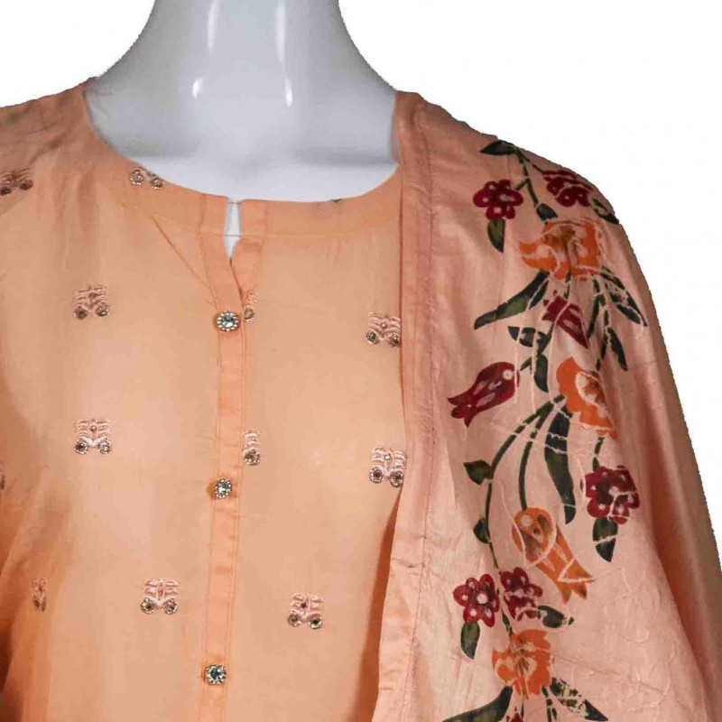 - Peach color with Embroidery and Printed Dupatta ,has Taping Border.