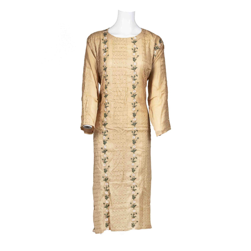 - Front Down part beautiful design taping border. Has a round neck with beautiful Chanderi Work .Three quarter sleeves, side slits.