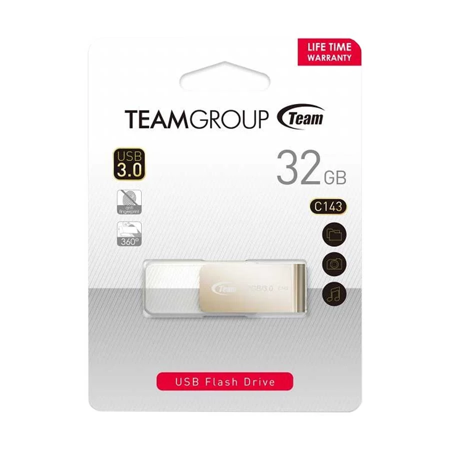 Brand - Team, Model - Team C143 32GB, Interface - USB 3.2, Connector Type - USB Type-A, USB Generation - Gen 1, Capacity (GB) - 32GB, Access Time Read (Mbps) - 75MB/s, OS Supported - Windows10, Windows 8.1, Windows 8, Windows 7, Windows Vista, Mac OS X v.10.6.x+, Linux v.2.6.x+, Color - White, Dimension - 53.8 x 18.0 x 9.7mm, Weight - 15gm, Others - Hot Plug: Yes, Specialty - Seamless integration rotation design. Non-drop and strap hole design. Support of hot swapping and plug & play. Backward compatible USB 2.0/1.1 transmission interface, No external power is necessary, Support of power saving mode., Part No - TC143332GW01, Warranty - Product Lifetime