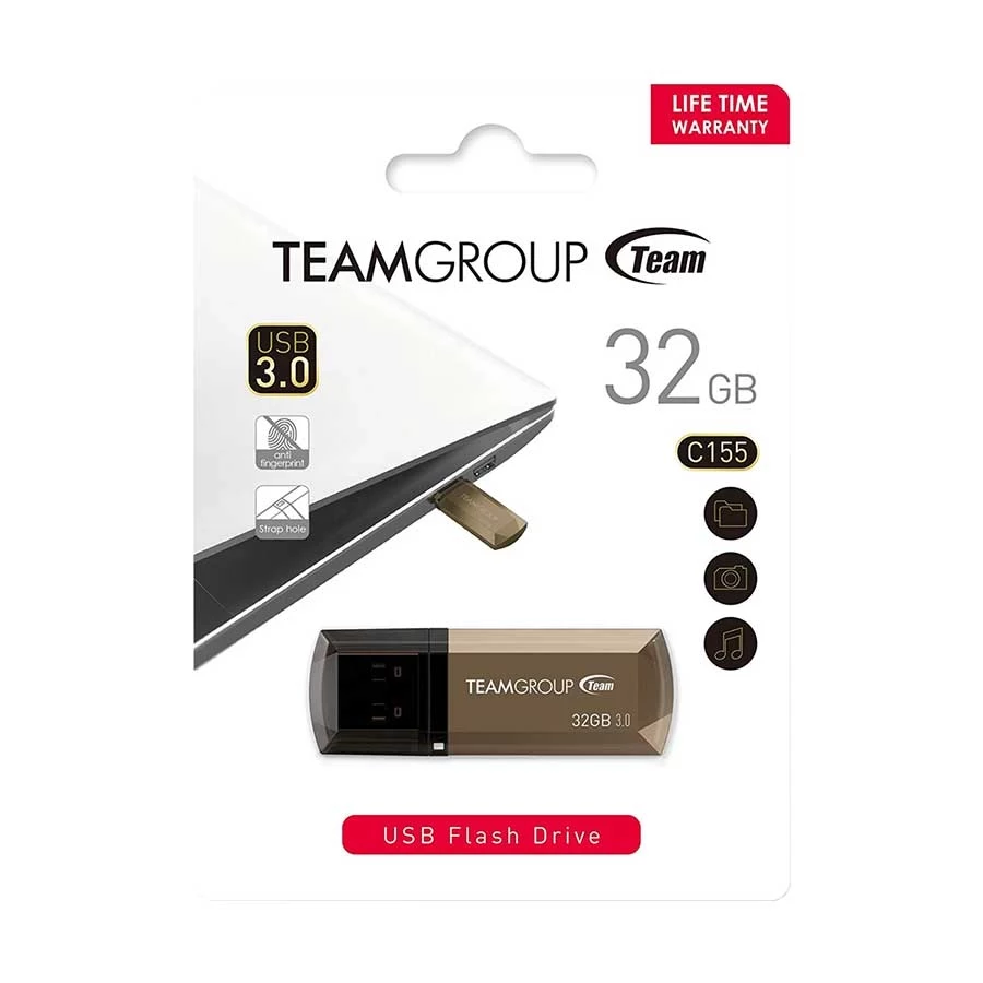 Brand - Team, Model - Team C155 32GB, Interface - USB 3.2, Connector Type - USB Type-A, USB Generation - Gen 1, Capacity (GB) - 32GB, Access Time Read (Mbps) - 75MB/s, OS Supported - Windows10, Windows 8.1, Windows 8, Windows 7, Windows Vista, Mac OS X v.10.6.x+, Linux v.2.6.x+, Color - Golden, Dimension - 54.4 x 19.3 x 7.3mm, Weight - 12gm, Others - Voltage: DC 5V, Part No - TC155332GD01, Warranty - Product Lifetime.