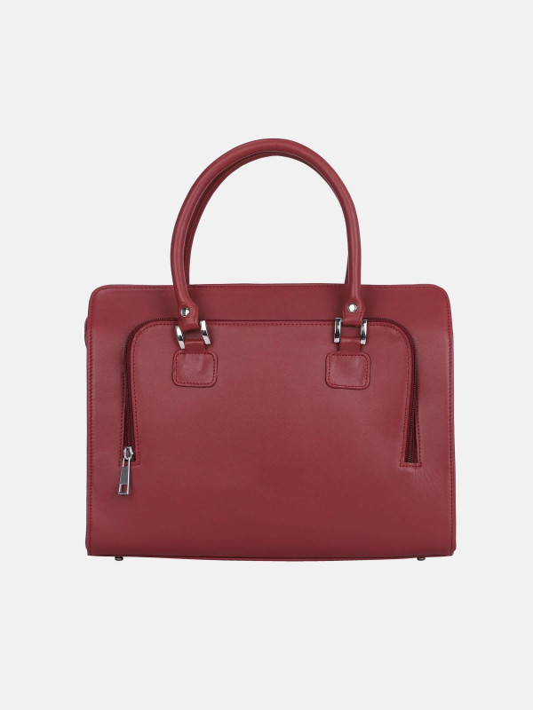 -Brick red leather bag with gabardine lining. Features zip closure, one front zip pocket, multiple compartments and pockets and two leather handles.