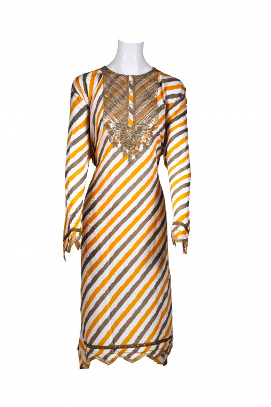 - Yellow, White And Camel Brown Color Stripped Straight Calf Length. Has a Round Neck With Beautiful Zari Sequence Lace. Three Quarter Sleeves, side slits.