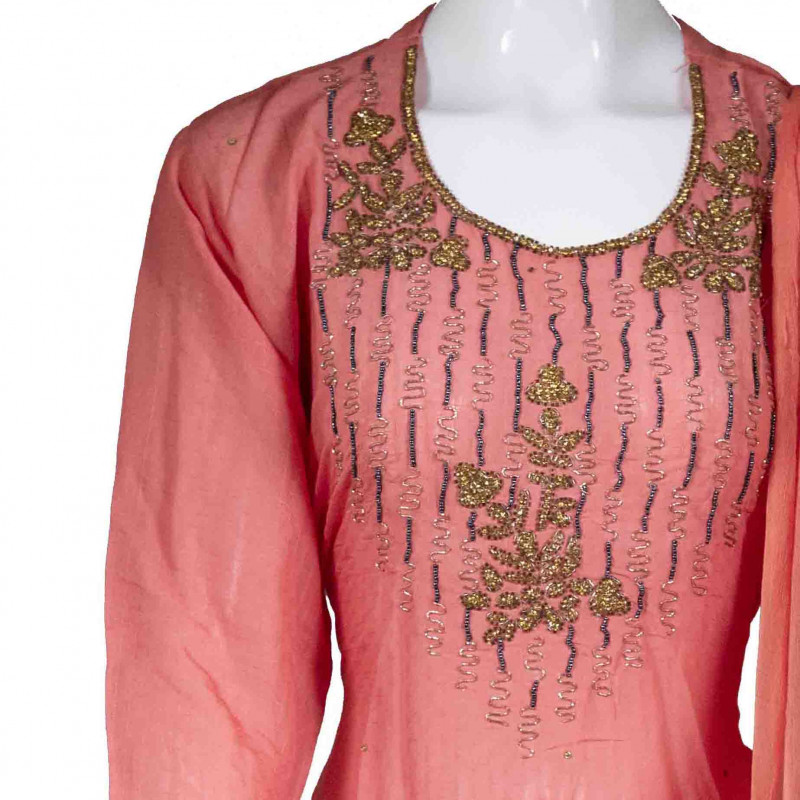 - Peach color with Chanderi work whole Kameez. Front -down part beautiful design taping border. Has a round neck with beautiful Chanderi Work .Three quarter sleeves, side slits.