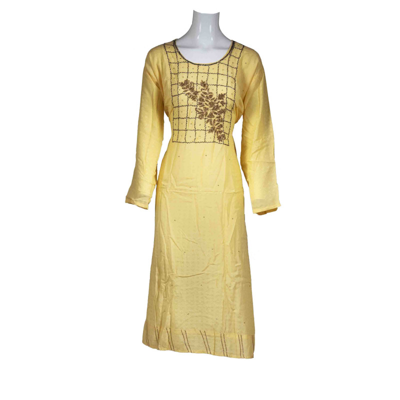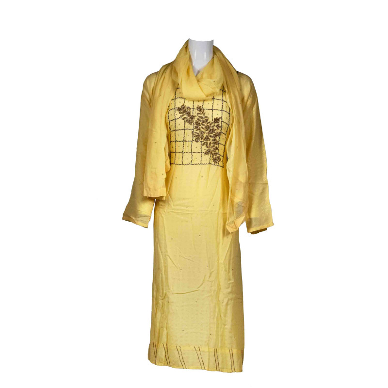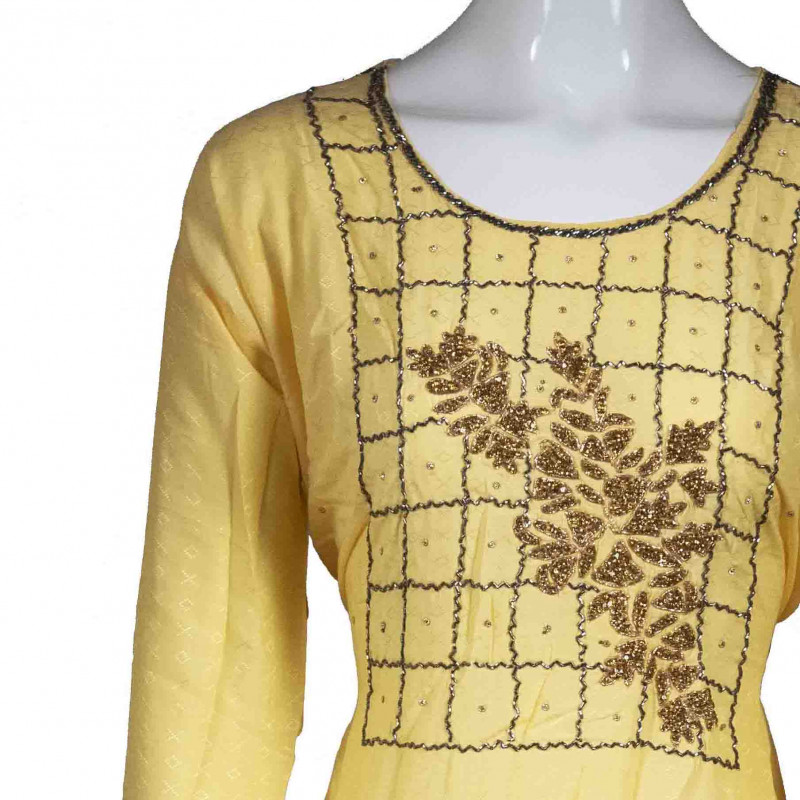 - Yellow color with Chanderi work whole Kameez. Front -down part beautiful design taping border. Has a round neck with beautiful Chanderi Work .Three quarter sleeves, side slits.