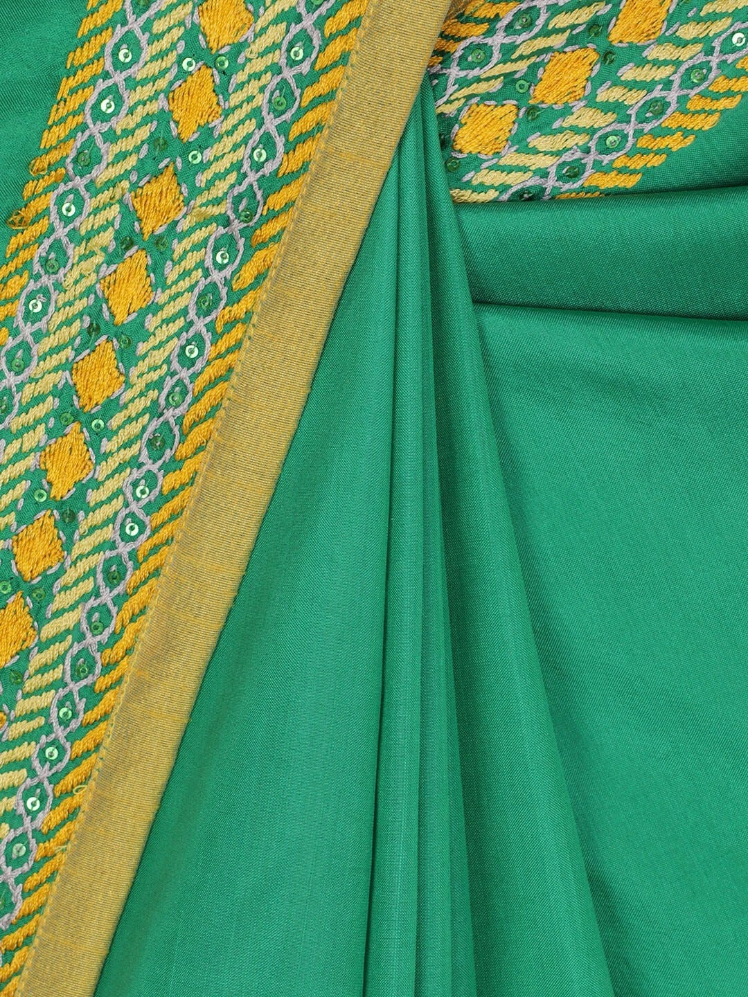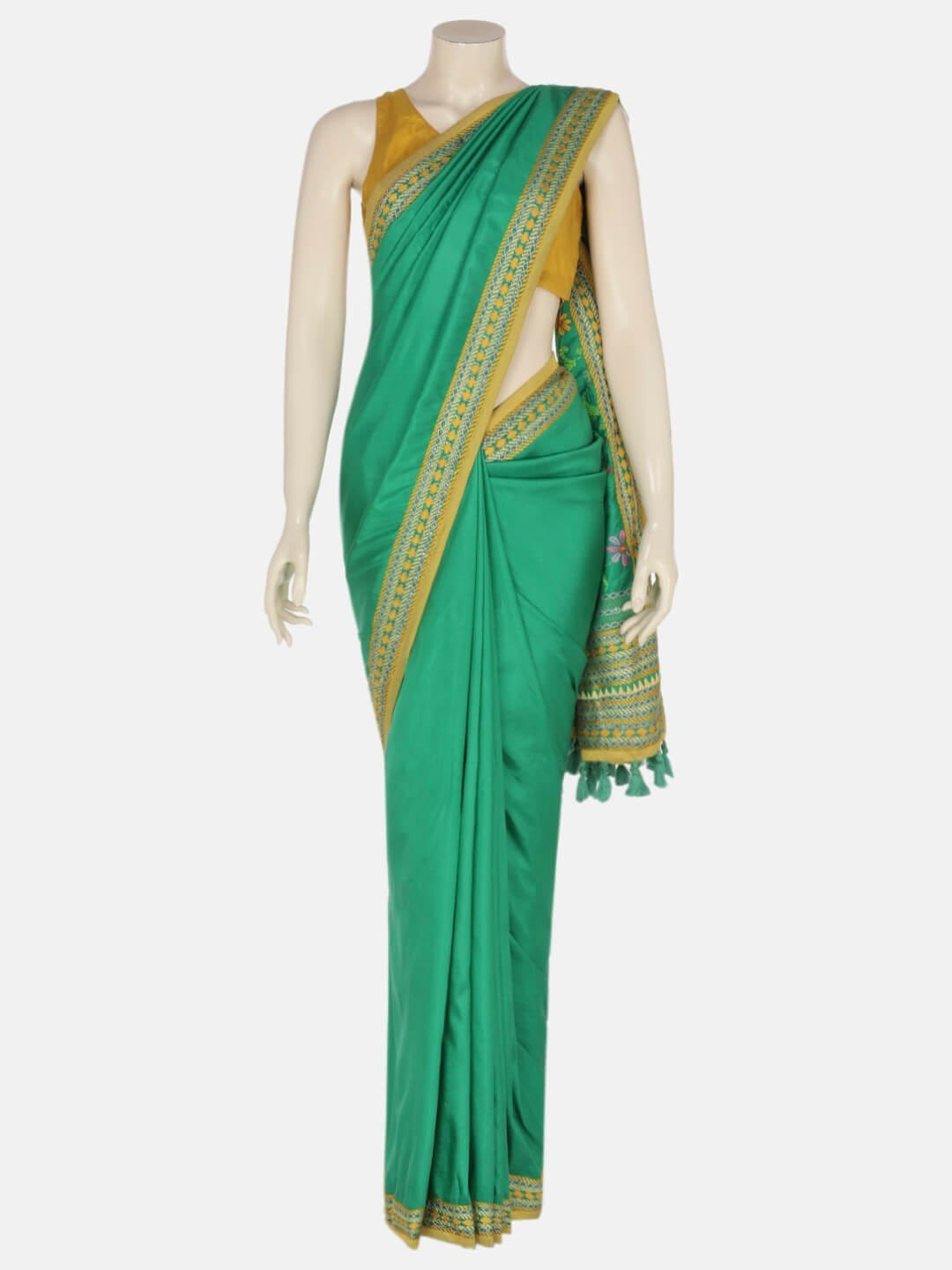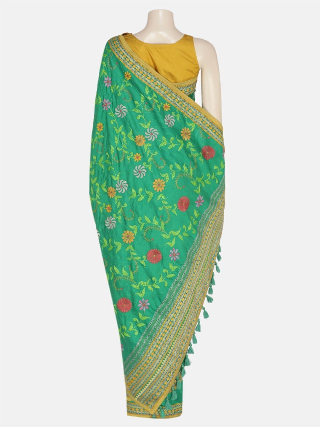 Green silk saree with multi-colour Nakshi Kantha embroidery.