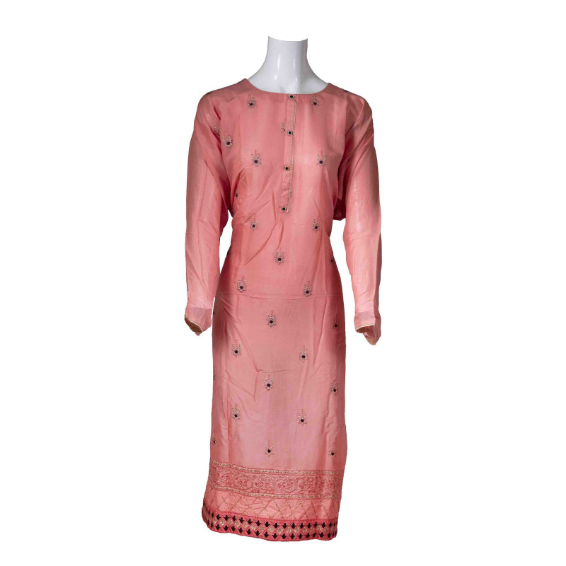 - Peach color with embroidery work whole Kameez. Front -down part with beautiful taping border embroidery work. Has a round neck with beautiful taping border lace. Three quarter sleeves, side slits.