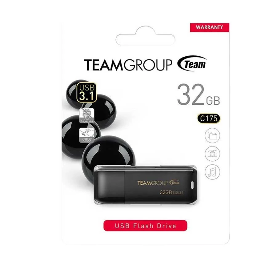 Brand - Team, Model - Team C175 32GB, Interface - USB 3.2, Connector Type - USB Type-A, USB Generation - Gen 1, Capacity (GB) - 32GB, Access Time Read (Mbps) - 75MB/s, OS Supported - Windows 10 / 8.1 / 8 / 7 / Vista, MAC OS 10.6 or later, Linux 2.6 or later, Color - Black, Dimension - 54.9 x 20.5 x 9.5mm, Weight - 9gm, Others - Voltage: DC+5V, Specialty - Rounded and streamlined appearance, Ingenious seamless design, Thoughtful cap-loss free design for easy storage, Plug and play interface, Support hot swap, Support power saving mode, Part No - TC175332GB01, Warranty - Product Lifetime.